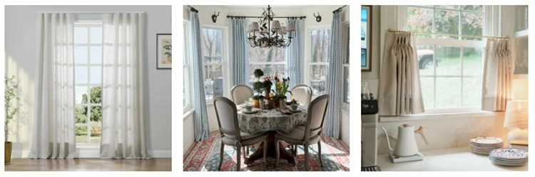 | Farmhouse chic | Valances or linen café | Beige, check, ivory | Linen blend |