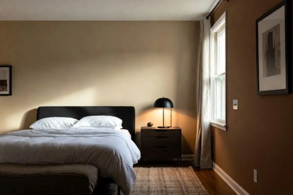 Warm brown and sandy hues can also make a bedroom feel serene. They offer a cozy, enveloping feel that complements neutral furniture and textiles. Painting a bedroom in earthy tones can transform a simple space into a layered, inviting retreat.