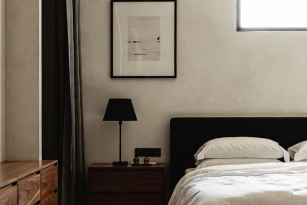 The finish of the paint affects how the color reads in a space. Matte or flat finishes absorb light and make colors feel softer, while satin and eggshell finishes reflect light and appear more vibrant. In bedrooms, many designers recommend matte or eggshell for walls because these finishes create a calm, sophisticated atmosphere while hiding minor imperfections.