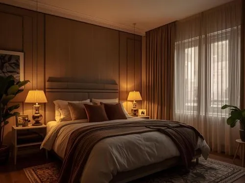 A calming bedroom typically includes ambient lighting for overall glow, task lighting for reading or dressing, and accent lighting to add depth. Table lamps, wall sconces, and floor lamps work together to create a balanced atmosphere.