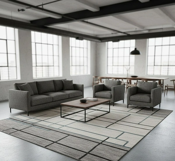 • Solution: Choose a 9′ × 12′ rug that sits under the sofa, chairs, and coffee table. Leave a consistent border to frame the shape. Use a wool blend for softness, and pick a modern pattern that echoes the loft’s industrial-meets-minimal aesthetic.