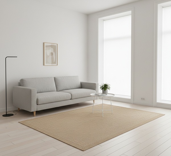 Imagine you have a minimalist, Scandinavian-style living room with a light gray sofa, white walls, and pale wood floors. A flat-woven jute rug in natural tones could enhance the airy vibe. If you prefer a more dramatic contrast, a modern geometric rug with black-and-white or soft pastel lines could anchor the space without overwhelming the simplicity.
